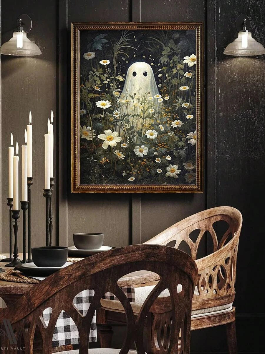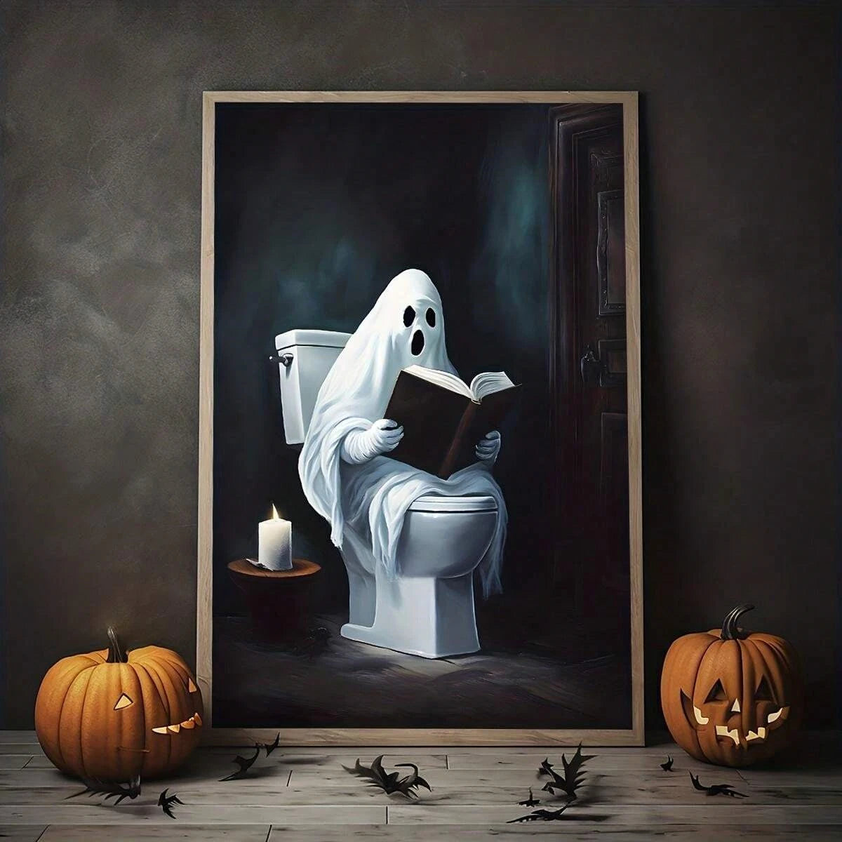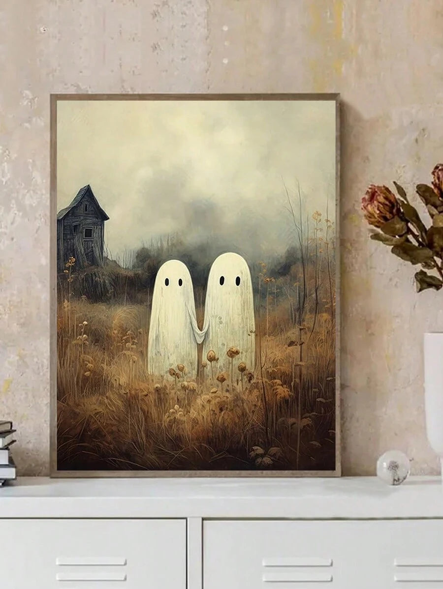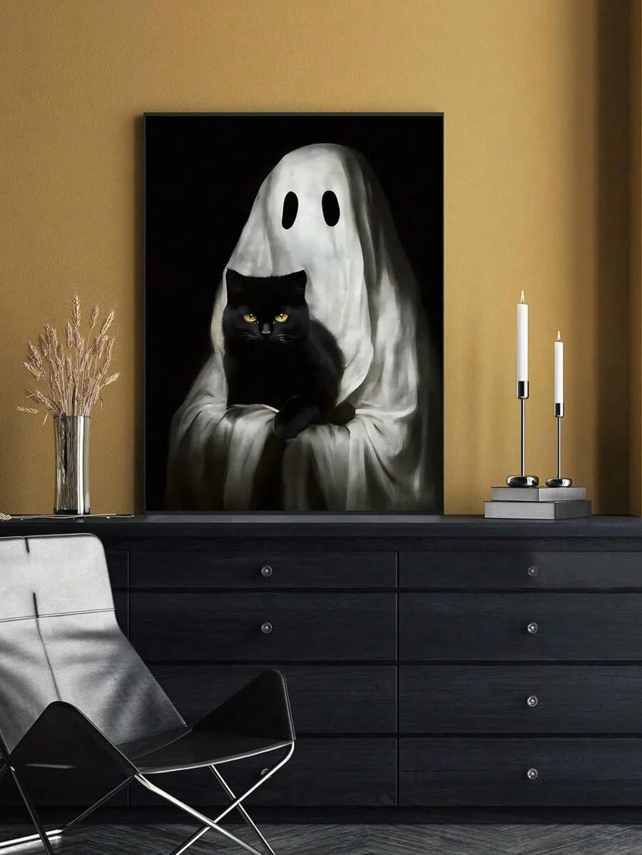 Retro Cute Ghost Companion & Reads Book Canvas Prints Monster Holds Black Cat Wall Art Poster for Living Room Halloween Decor